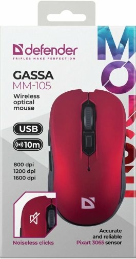 Defender Gassa MM-105 — це бездротова мишка, яка пропонує зручність та свободу руху без обмежень проводів. Завдяки бездротовому з'єднанню, ви можете використовувати мишку на відстані від комп'ютера і не турбуватися про заплутані проводи. Ця мишка має ергономічний дизайн, що дозволяє комфортно тримати її в руці протягом тривалого часу. Оптимальне розташування кнопок дозволяє швидко та легко виконувати різні дії без зайвих зусиль. Мишка Defender Gassa MM-105 має оптичний сенсор Pixart 3065, який забезпечує точне відстежування рухів та плавну реакцію. Підтримує три режими чутливості сенсора (800/1200/1600 dpi), що дозволяє вам налаштувати швидкість курсора відповідно до ваших вподобань. Спеціальна кнопка дозволить змінювати чутливість одним натисканням. Мишка працює на частоті 2.4 ГГц, що забезпечує стабільне та надійне бездротове з'єднання з комп'ютером. Вона має достатню дальність дії (10 метрів), щоб ви могли використовувати її зручно навіть на відстані від комп'ютера. Щодо живлення, мишка використовує батарейку типу АА, що забезпечує довгу тривалість роботи без необхідності постійного підключення до джерела живлення. Мишка Defender Gassa MM-105 є зручним та надійним бездротовим рішенням, яке дозволяє вам насолоджуватися вільним рухом та точністю в роботі з комп'ютером.